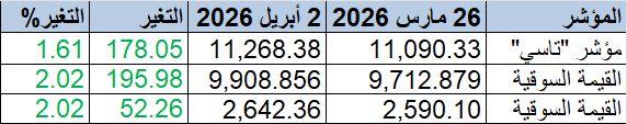 مؤشر "تاسي" يسجل مكاسب أسبوعية 1.61%.. والقيمة السوقية تربح 196 مليار ريال, اليوم الخميس 2 أبريل 2026 06:30 مساءً