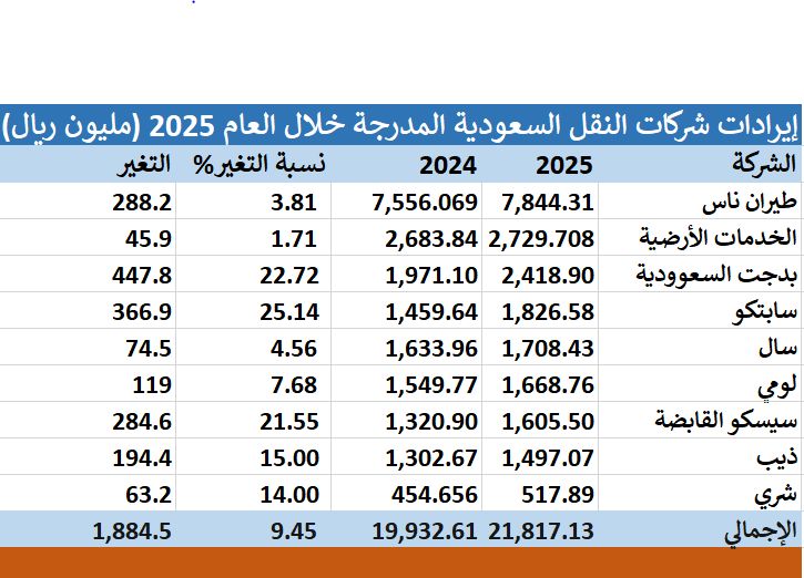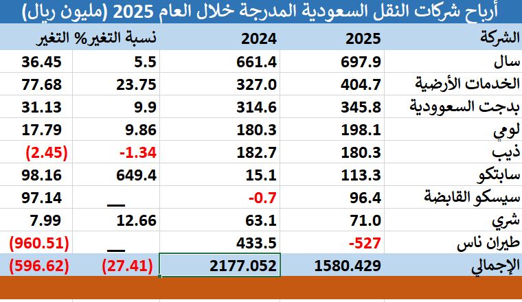 مباشر - بدور الراعي: سجل قطاع النقل السعودي تراجعا بصافي أرباحه خلال العام 2025 ، بنسبة 27.4%، بما يعادل 596.62 مليون ريال ؛ بضغط من الخسائر التي تكبدتها "طيران ناس" السنوية.