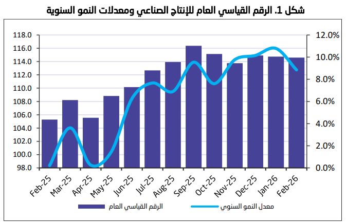 الرياض – مباشر: ارتفع مؤشر الرقم القياسي لكميات الإنتاج الصناعي في المملكة العربية السعودية بنسبة 8.9% خلال شهر فبراير/ شباط 2026م على أساس سنوي؛ مدعوما بارتفاع نشاط التعدين واستغلال المحاجر، ونشاط الصناعة التحويلية، ونشاط إمدادات المياه، وأنشطة الصرف الصحي، وإدارة النفايات ومعالجتها، فيما سجل المؤشر انخفاضا على أساس شهري بنحو 0.2%.