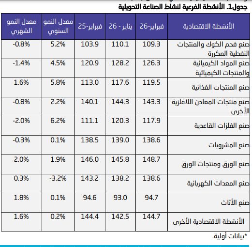 وارتفع مؤشر الرقم القياسي الفرعي لنشاط الصناعة التحويلية بنسبة 3.6% على أساس سنوي؛ مدعومًا بارتفاع نشاط صنع فحم الكوك والمنتجات النفطية المكررة الذي ارتفع بنسبة 5.2%، ونشاط صنع المواد الكيميائية والمنتجات الكيميائية الذي ارتفع بنسبة 4.5%.