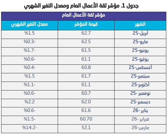 الرياض – مباشر: بلغ مؤشر ثقة الأعمال في المملكة العربية السعودية 52.1 نقطة خلال شهر مارس/ آذار 2026م، محافظاً على مستويات التفاؤل.