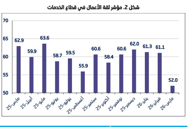 وخلال شهر مارس/ آذار الماضي، سجل مؤشر ثقة الأعمال في قطاع الخدمات 52.0 نقطة، محافظا على مستواه المتفائل رغم تراجعه بنسبة 14.9% مقارنة بشهر فبراير/ شباط، حيث سجل خلاله 61.1 نقطة، ويُعزى هذا الانخفاض إلى تراجع في مستويات الثقة المرتبطة بأوامر الشراء للشهر الحالي، وتكاليف المدخلات المتوقعة للشهر القادم.