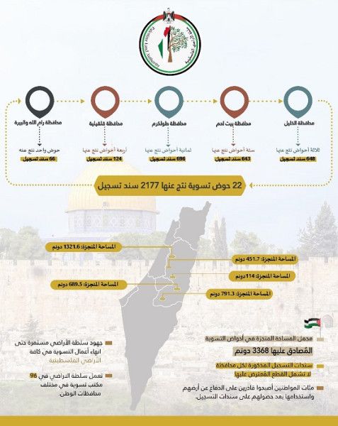 أعلنت سلطة الأراضي، اليوم الاثنين، عن إنجاز جديد في إطار استكمال أعمال مشروع تسوية الأراضي والمياه في محافظات الضفة الغربية، تمثل في المصادقة على 22 حوض تسوية في محافظات: الخليل، وبيت لحم، وطولكرم، وقلقيلية، ورام الله والبيرة، نتج عنها إصدار 2177 سند تسجيل لصالح المواطنين.