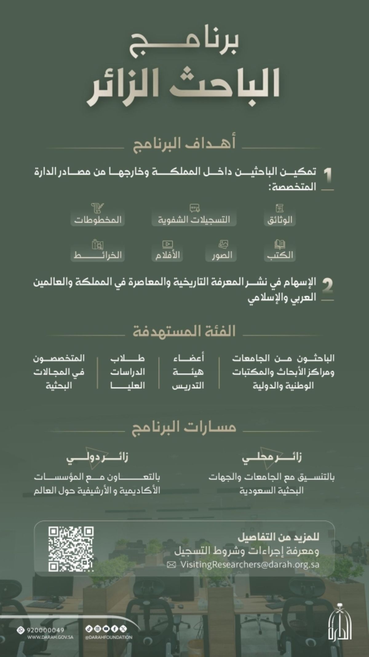 ودعت الدارة الباحثين والمهتمين لزيارة الصفحة المخصصة لبرنامج «الباحث الزائر» عبر الرابط: https://darah.gov.sa/visiting-researcher.