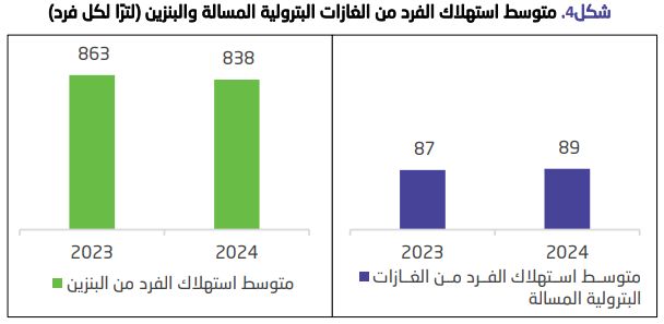 وفي المقابل، انخفض استهلاك الفرد في السعودية من البنزين من 863 لترا لكل فرد في عام 2023م إلى 838 لترا لكل فرد في عام 2024م، ليتراجع الاستهلاك بنحو 2.9%.