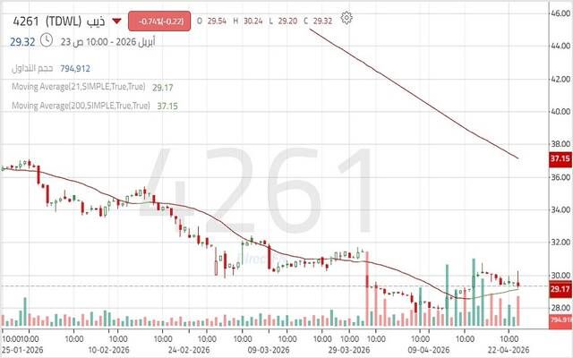 سهم "ذيب" يتحرك في اتجاه هابط رئيسي مع استمرار الضغوط البيعية, اليوم الخميس 23 أبريل 2026 02:36 مساءً