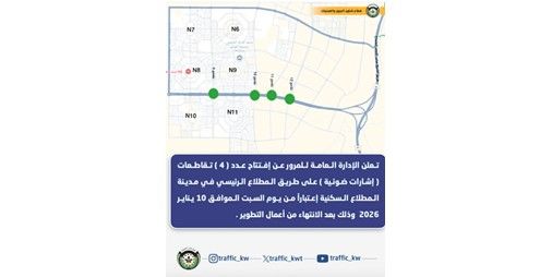 أعلنت الإدارة العامة للمرور عن افتتاح 4 تقاطعات «إشارات ضوئية» على طريق المطلاع الرئيسي في مدينة المطلاع السكنية اعتبارا من اليوم السبت 10 يناير، وذلك بعد الانتهاء من أعمال التطوير.